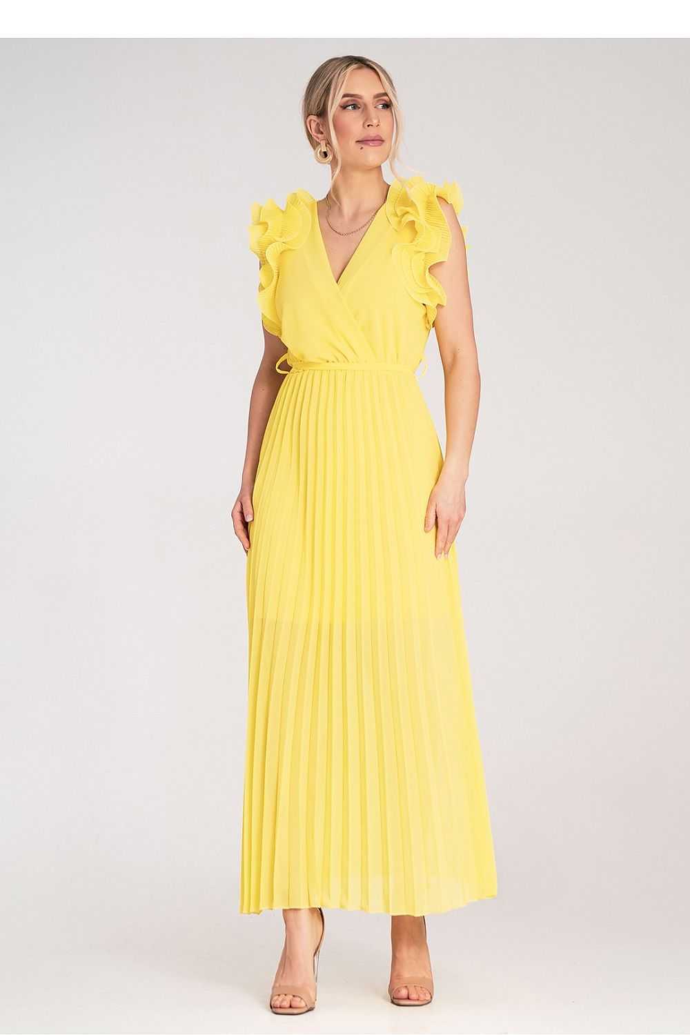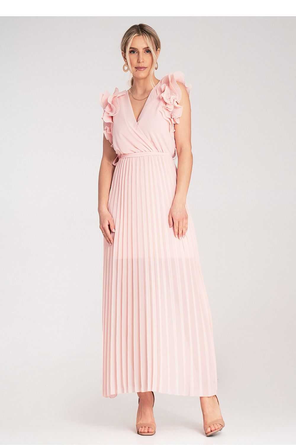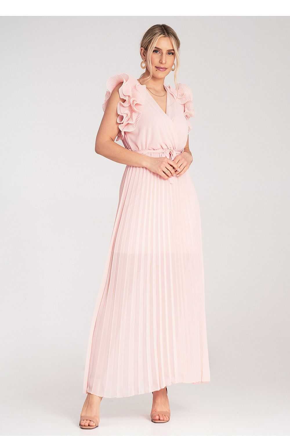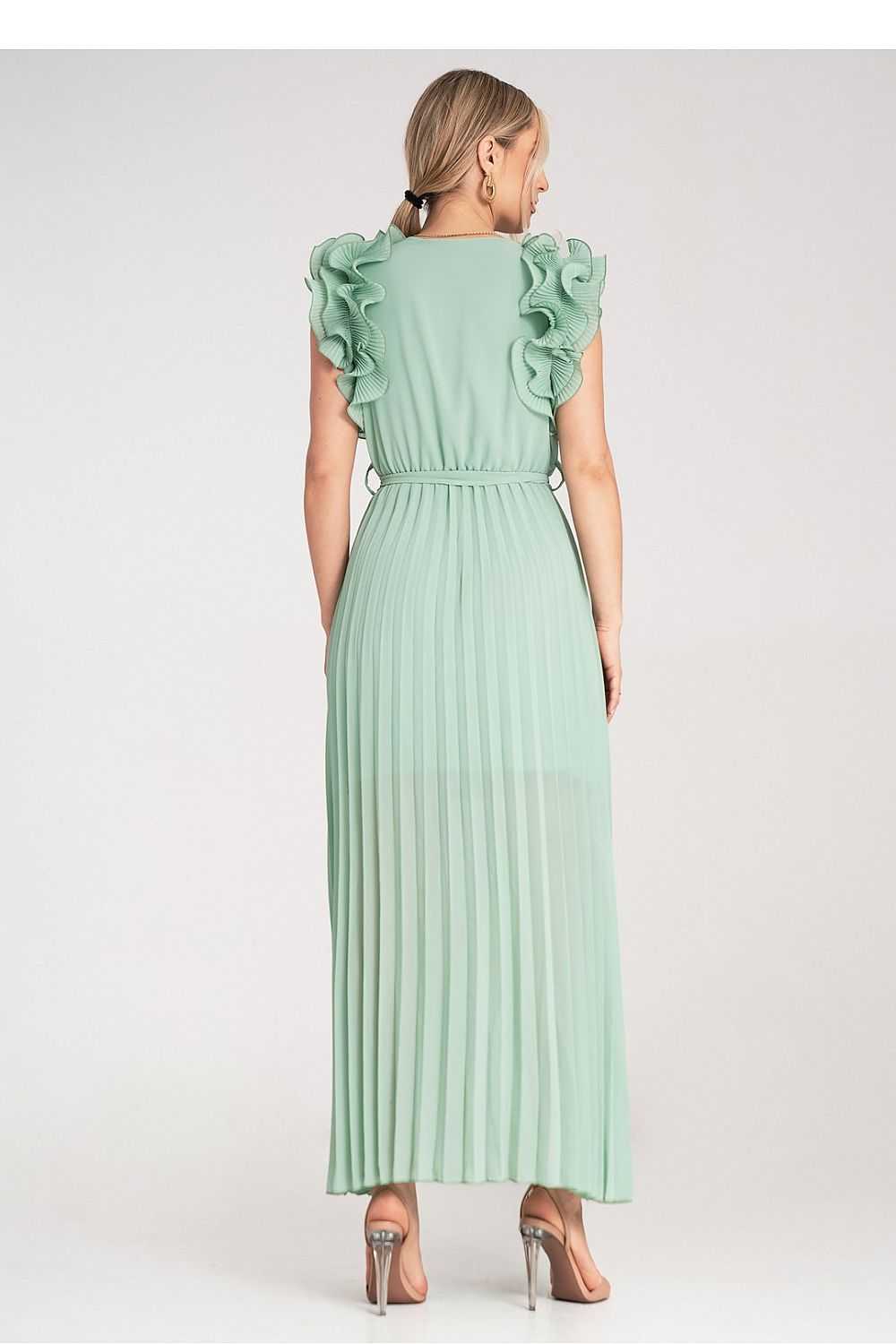Maxi dress with a wrap neckline and decorative, double ruffles on the shoulders. Elastic band and fabric belt for tying at the waist. The bottom is long, with small pleats, made of light, semi-transparent fabric.