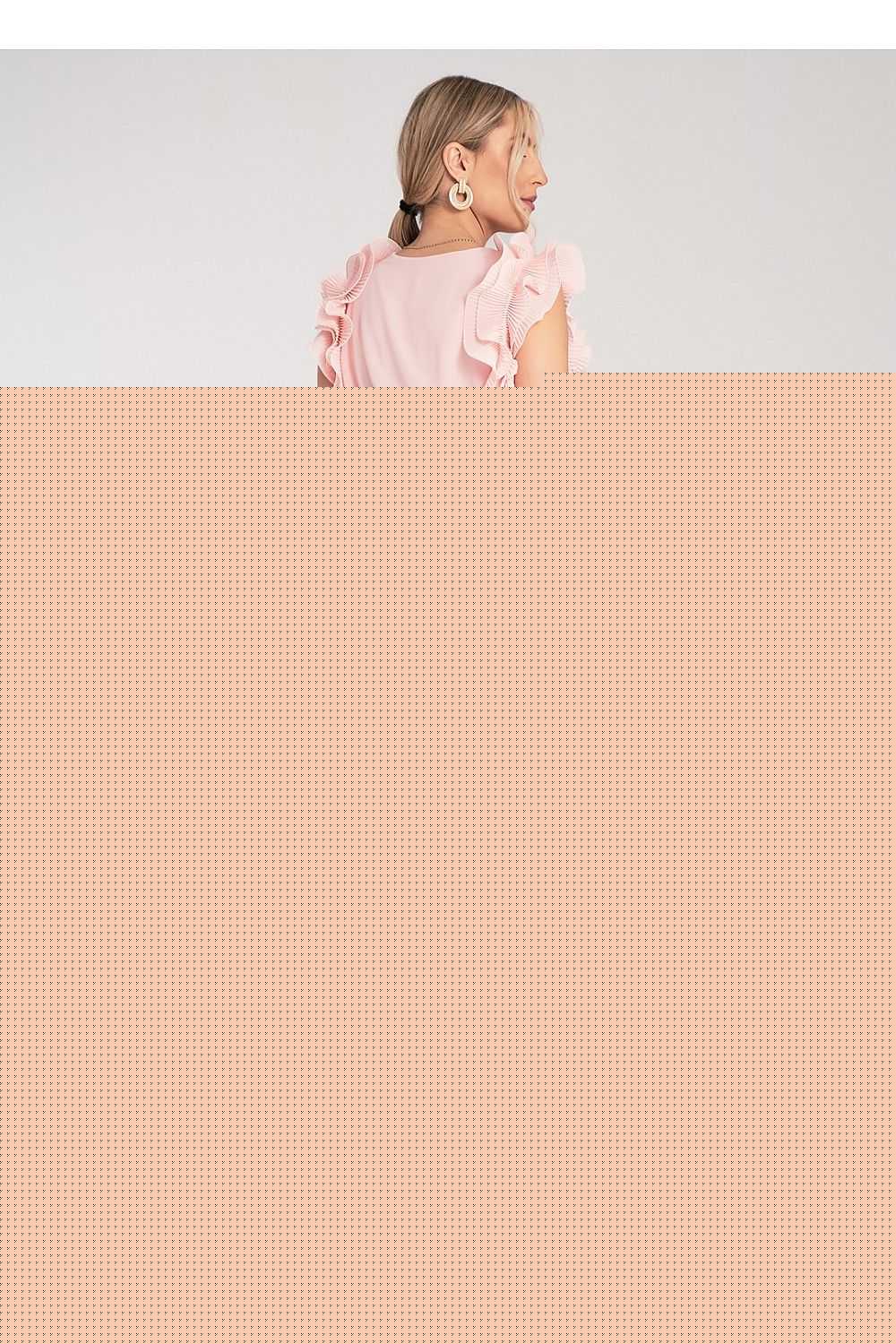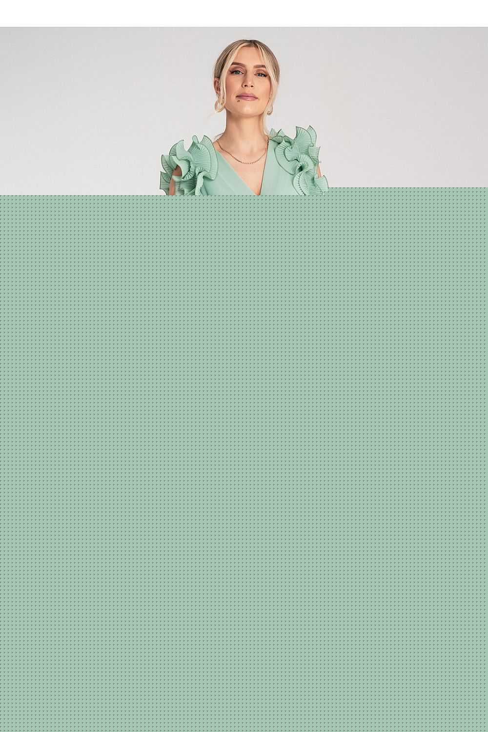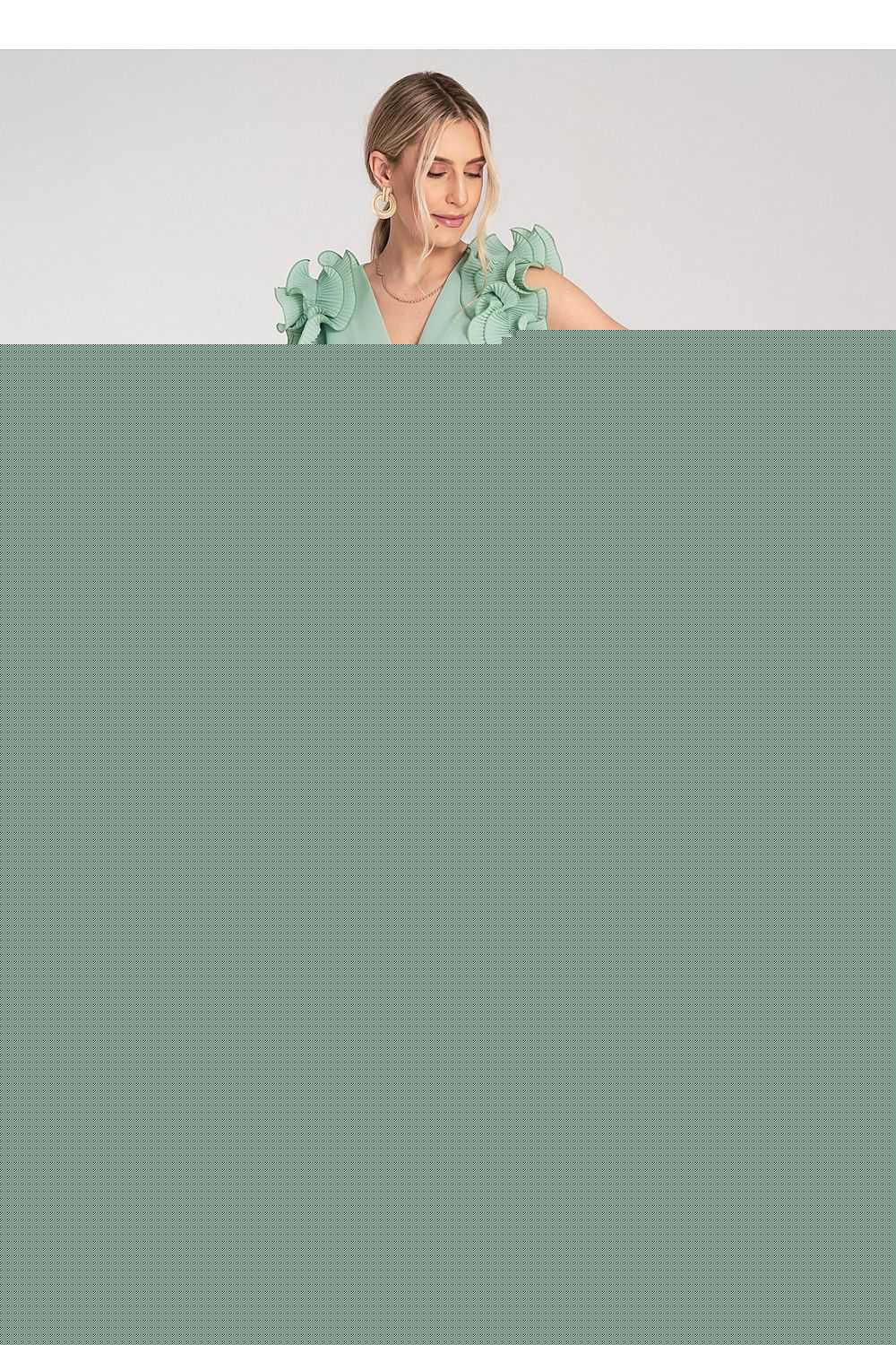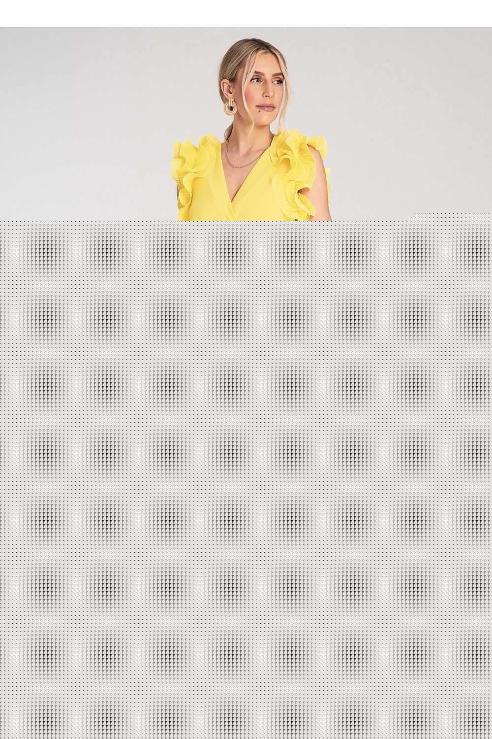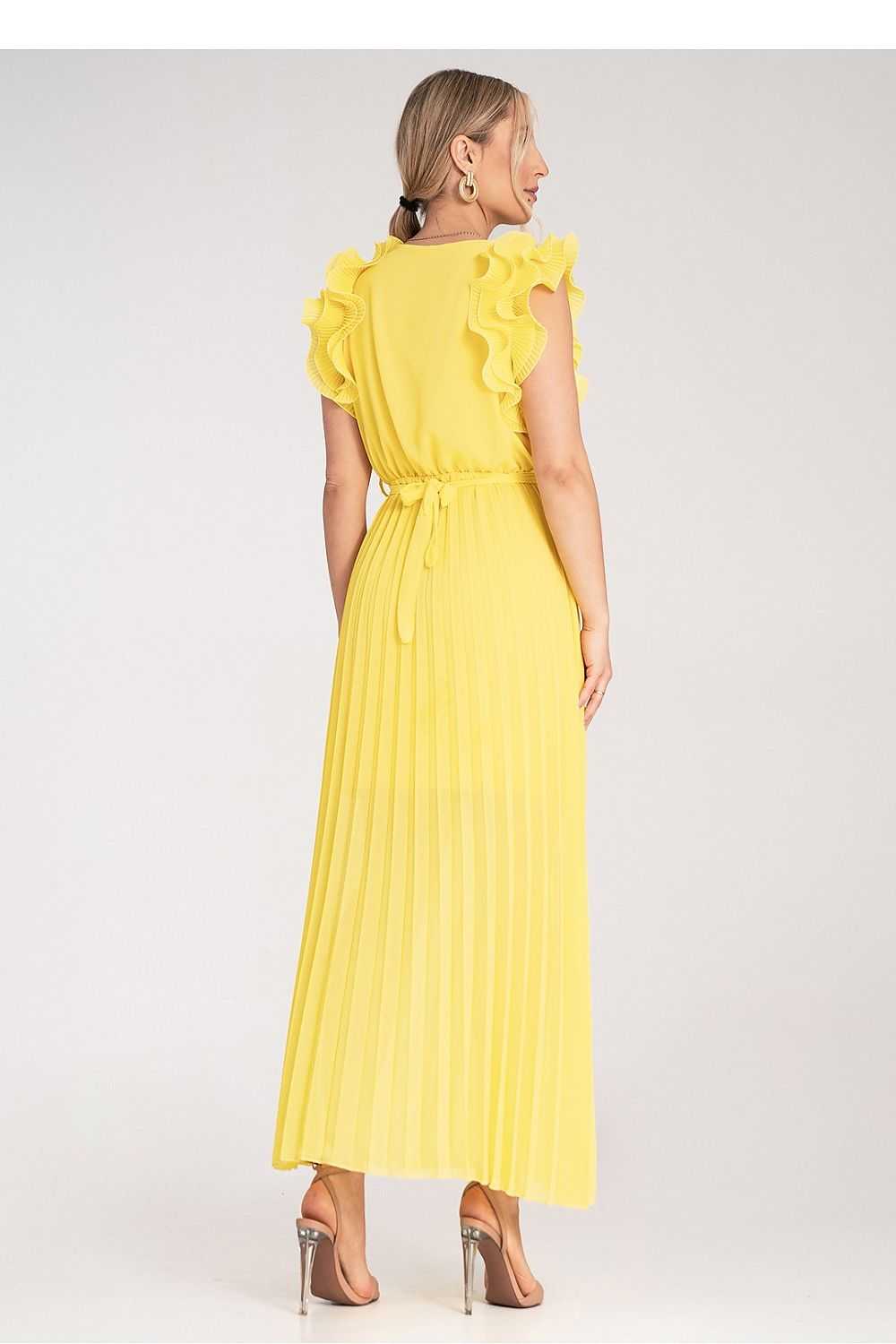 Maxi dress with a wrap neckline and decorative, double ruffles on the shoulders. Elastic band and fabric belt for tying at the waist. The bottom is long, with small pleats, made of light, semi-transparent fabric.