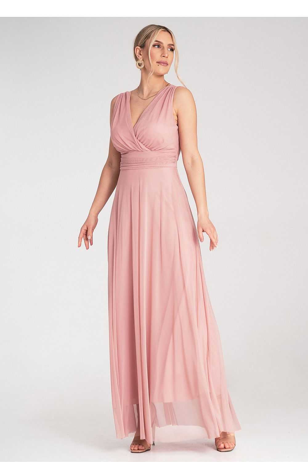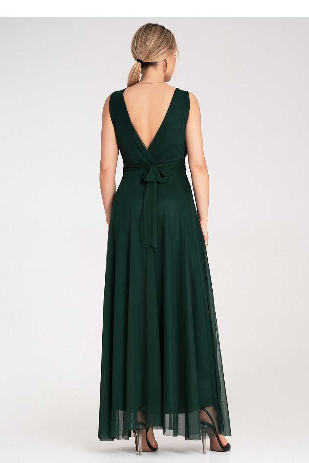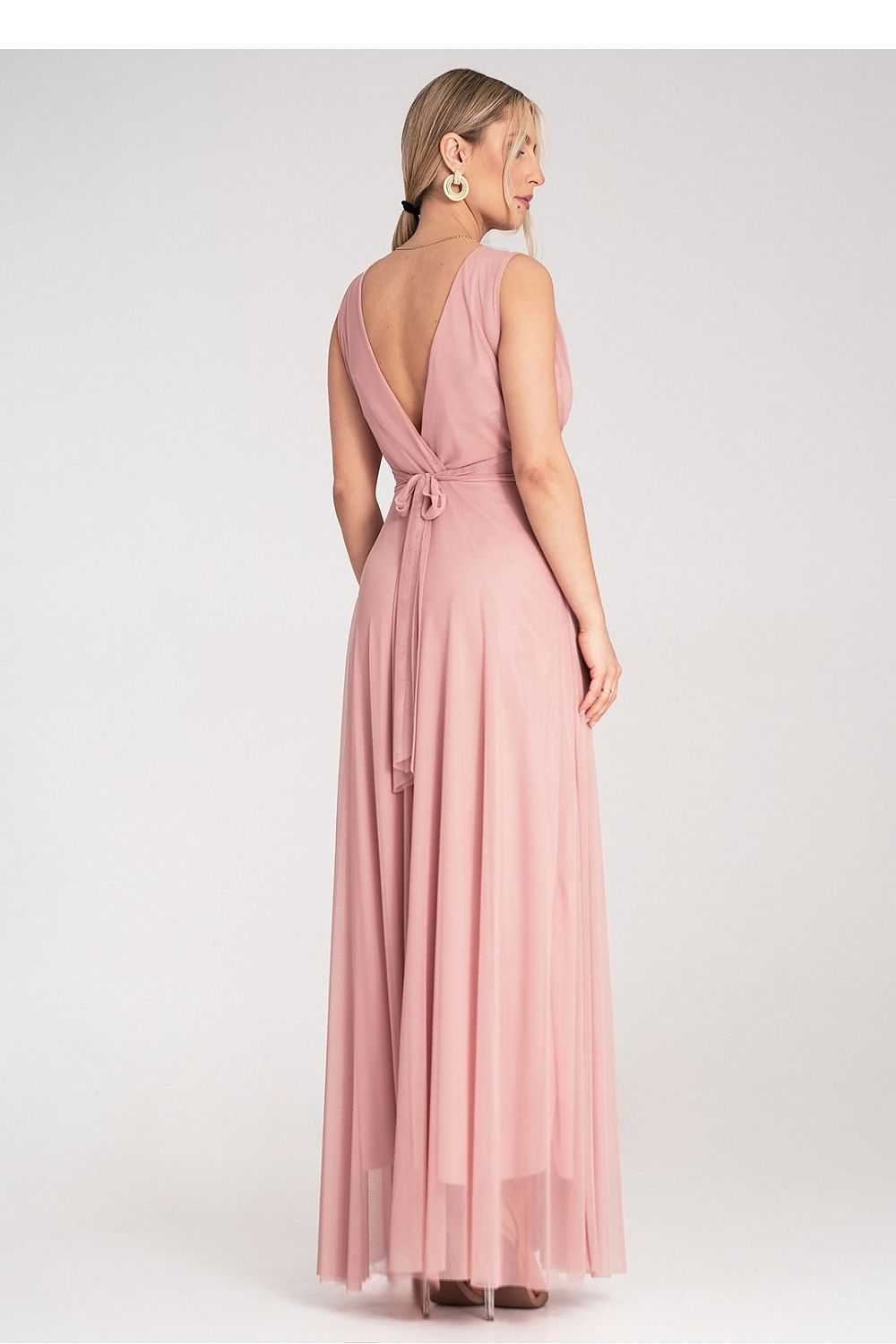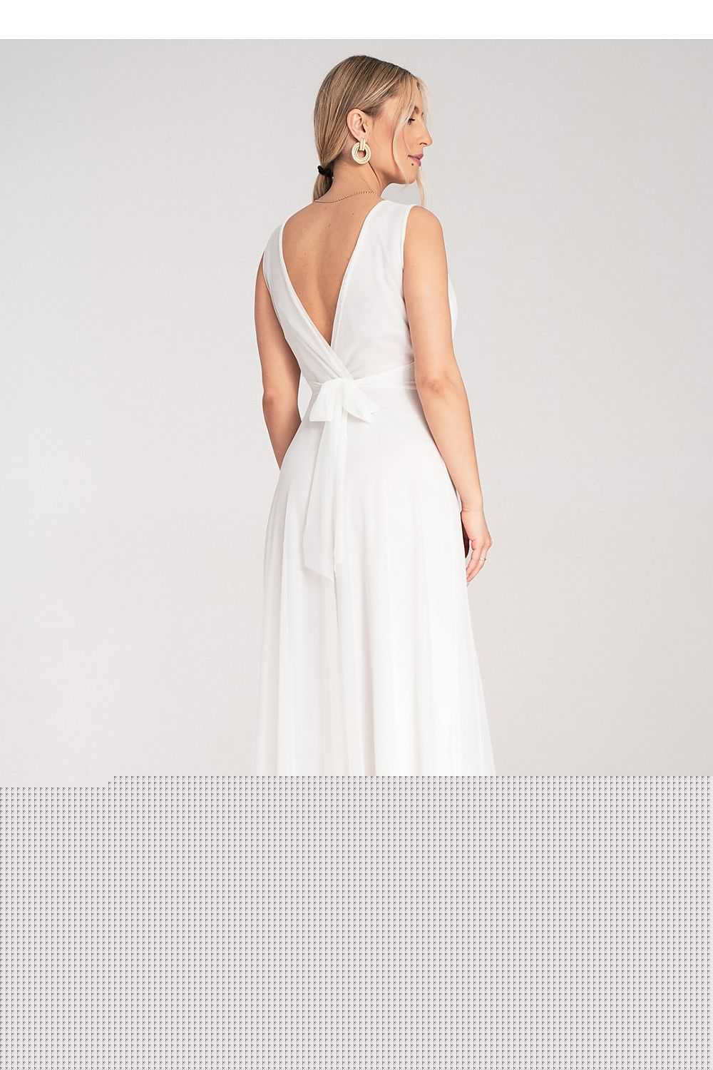 Maxi sleeveless dress with a wrap neckline at the front and a deep cut at the back. The top is delicately ruched, with a wide band under the bust. The back is tied in a bow.