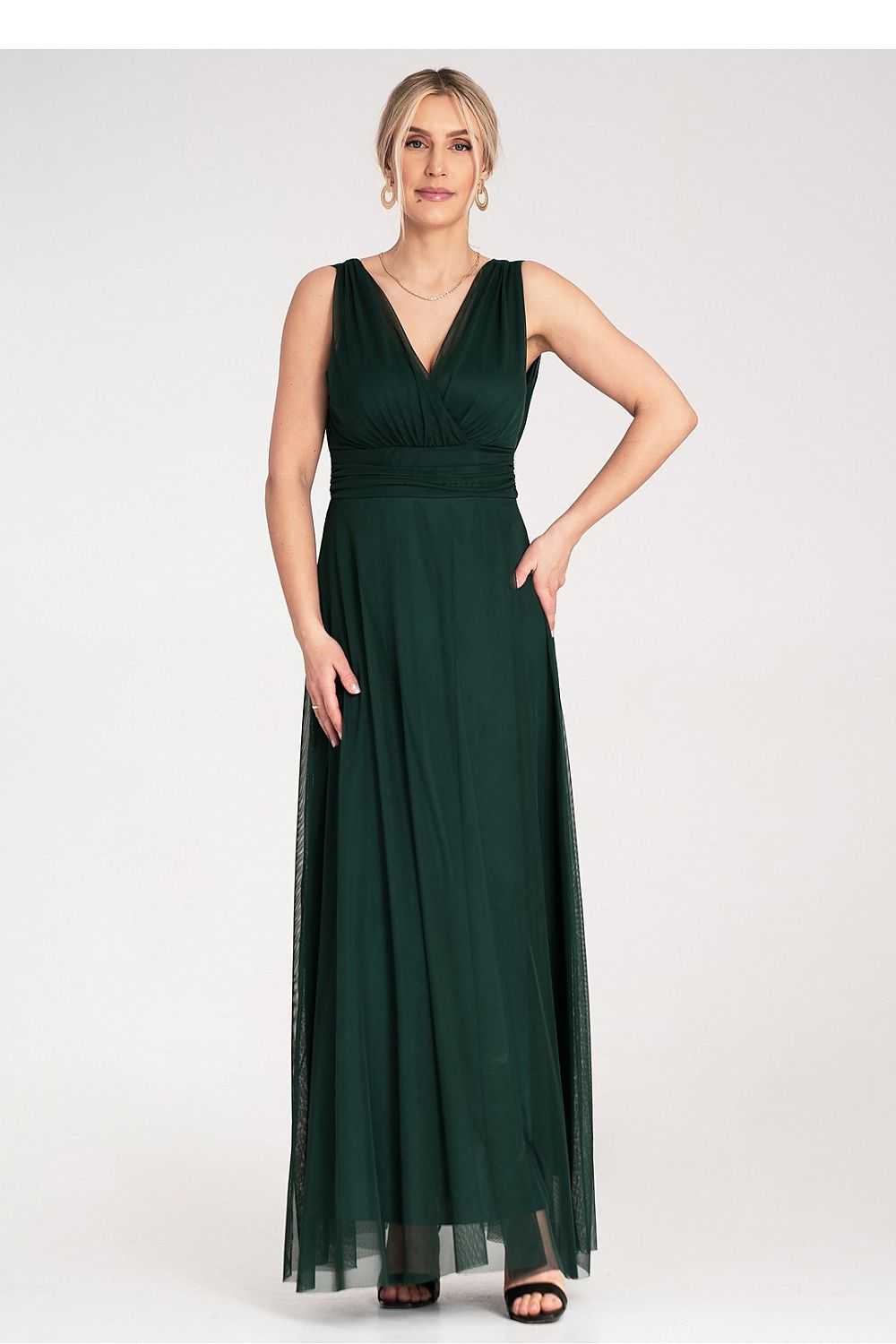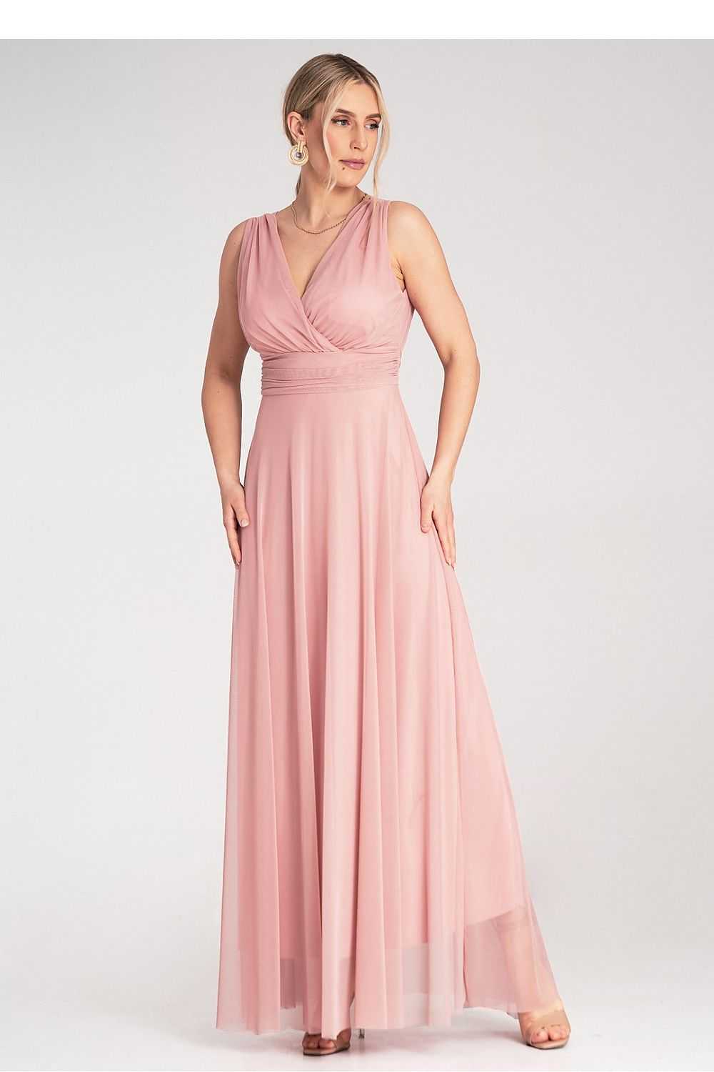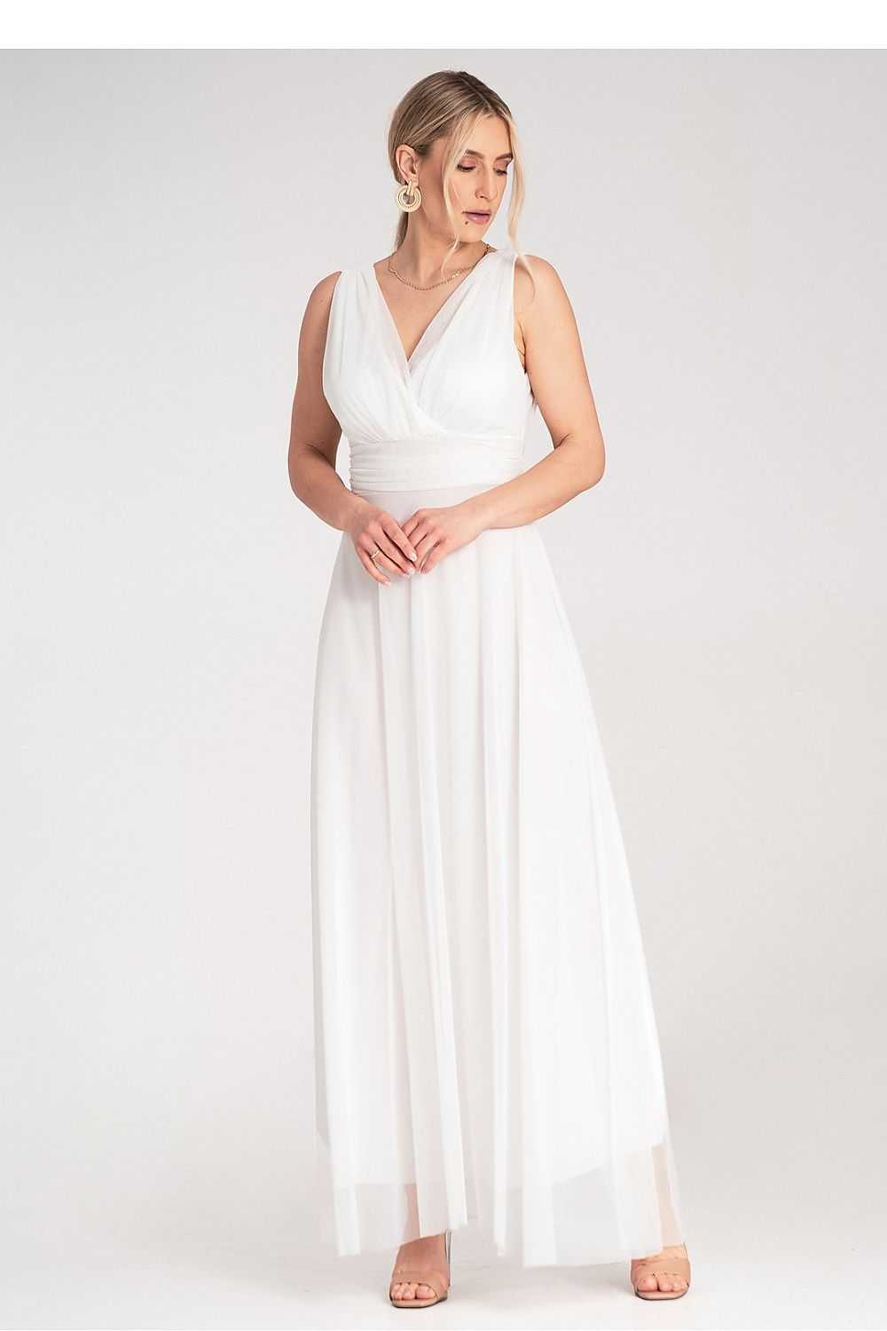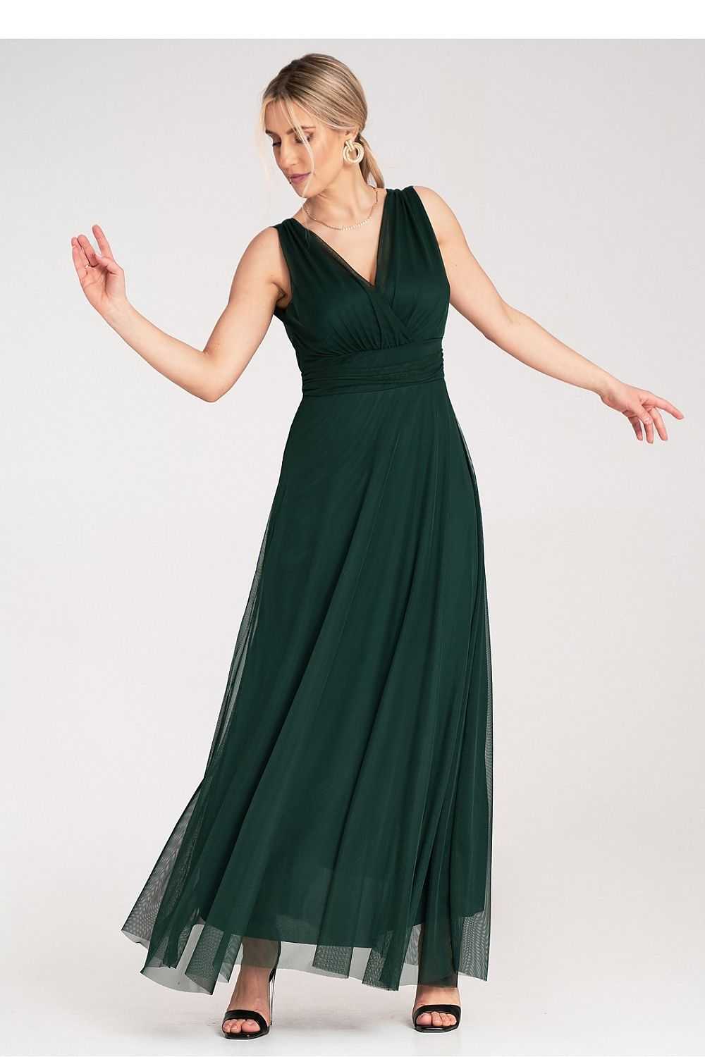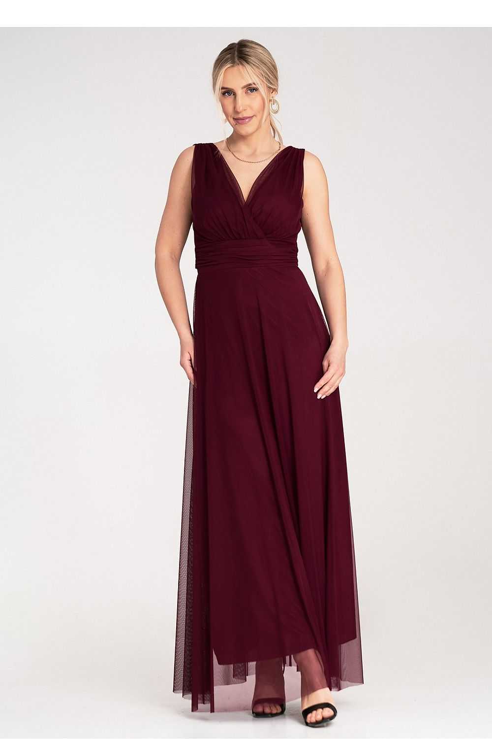 Maxi sleeveless dress with a wrap neckline at the front and a deep cut at the back. The top is delicately ruched, with a wide band under the bust. The back is tied in a bow.
