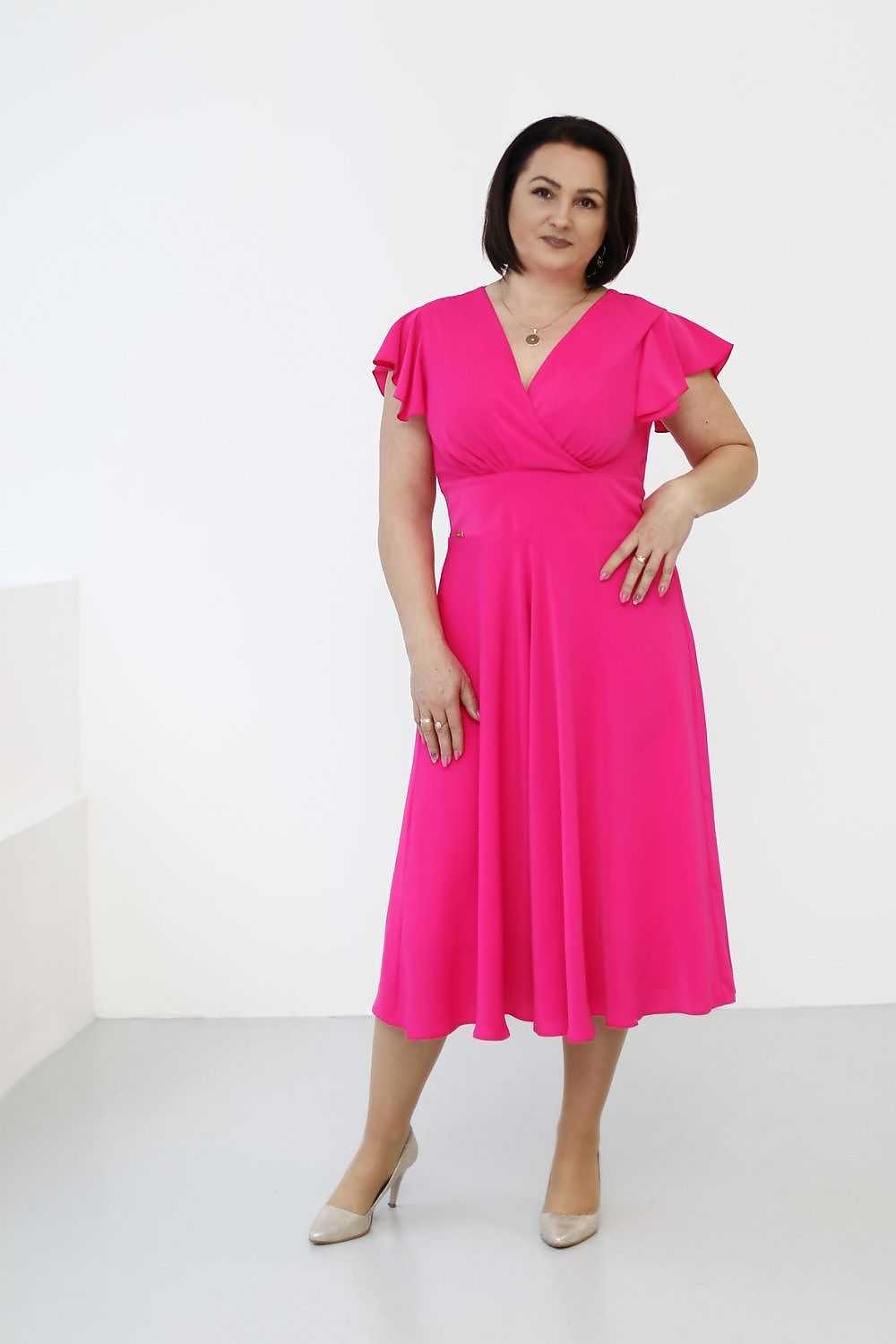 An elegant knee-length midi dress is the perfect choice for special occasions. The top in a wrap style beautifully accentuates the neckline, while the fitted cut emphasizes the waist, giving the silhouette a feminine shape. Flowy sleeves add lightness and subtle charm, while the elastic band at the back ensures a perfect fit and comfort. The dress is finished with a lining, which enhances its quality and comfort. The thoughtful cut effectively masks minor imperfections, making every woman feel special and confident in it.