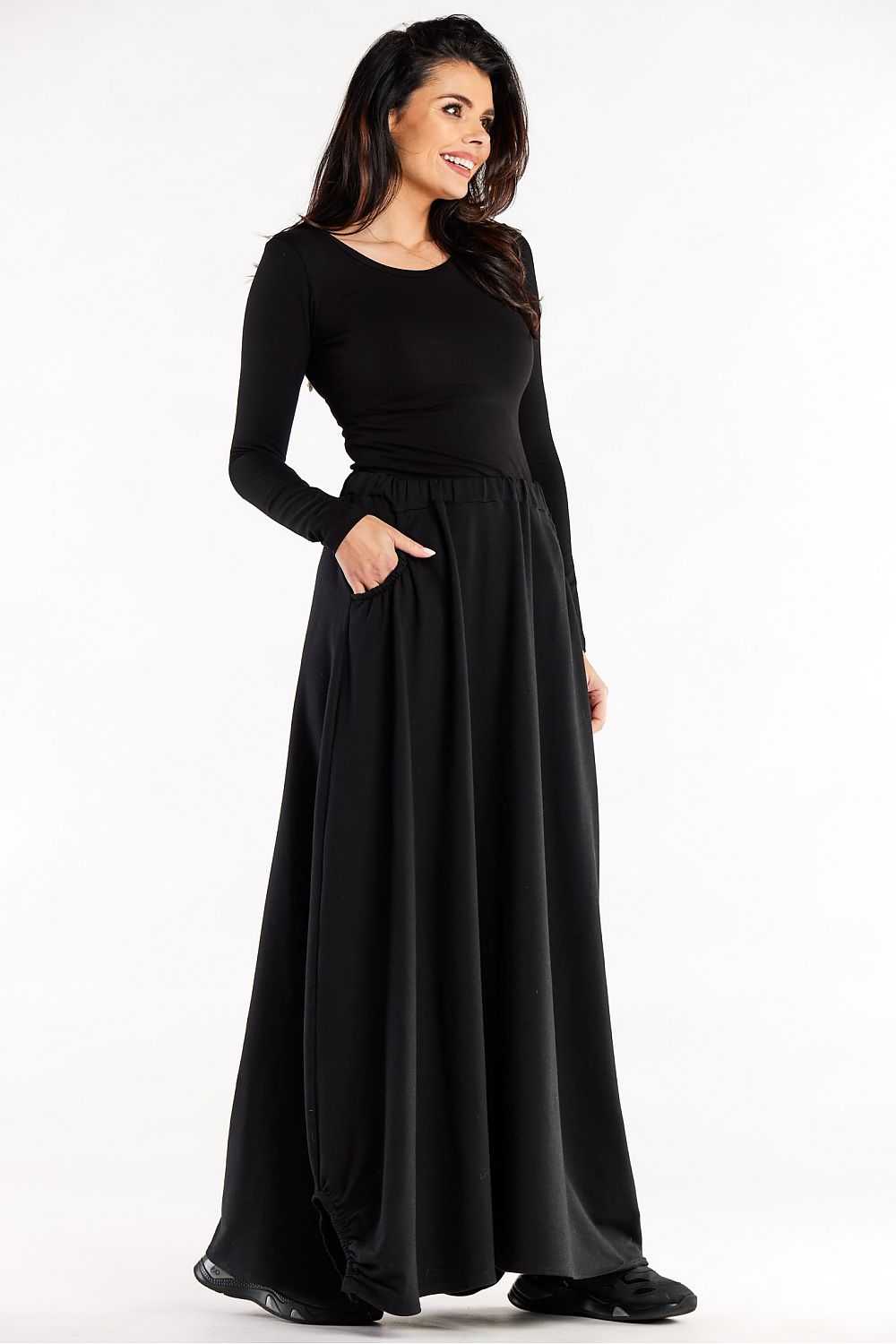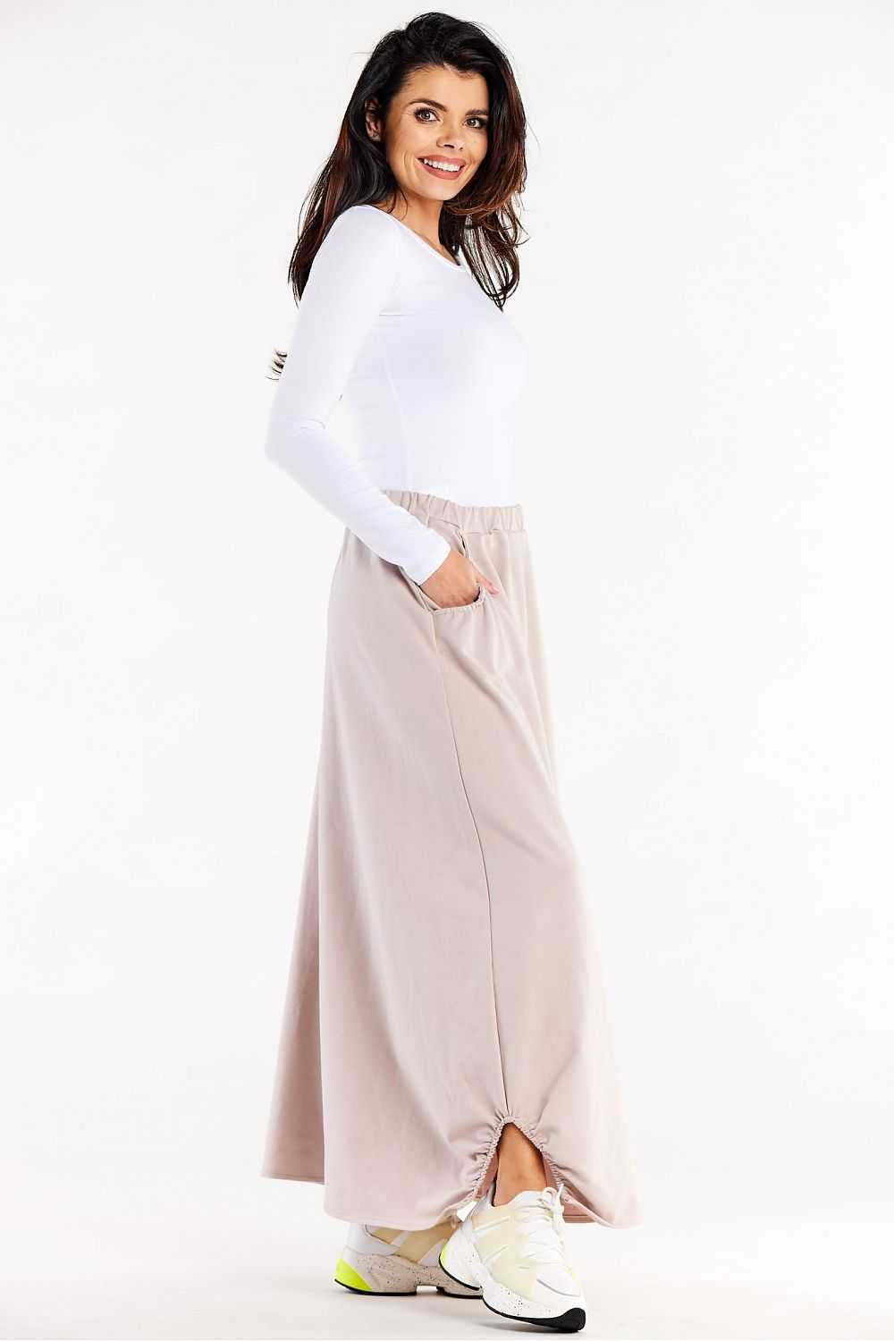 Trapeze long skirt with elastic waistband. Skirt with pockets finished with a crease. Decorative cutouts at the bottom finished with creases.