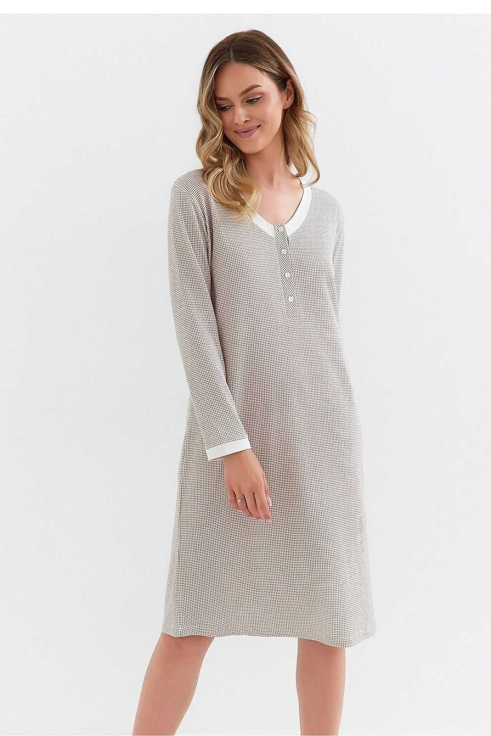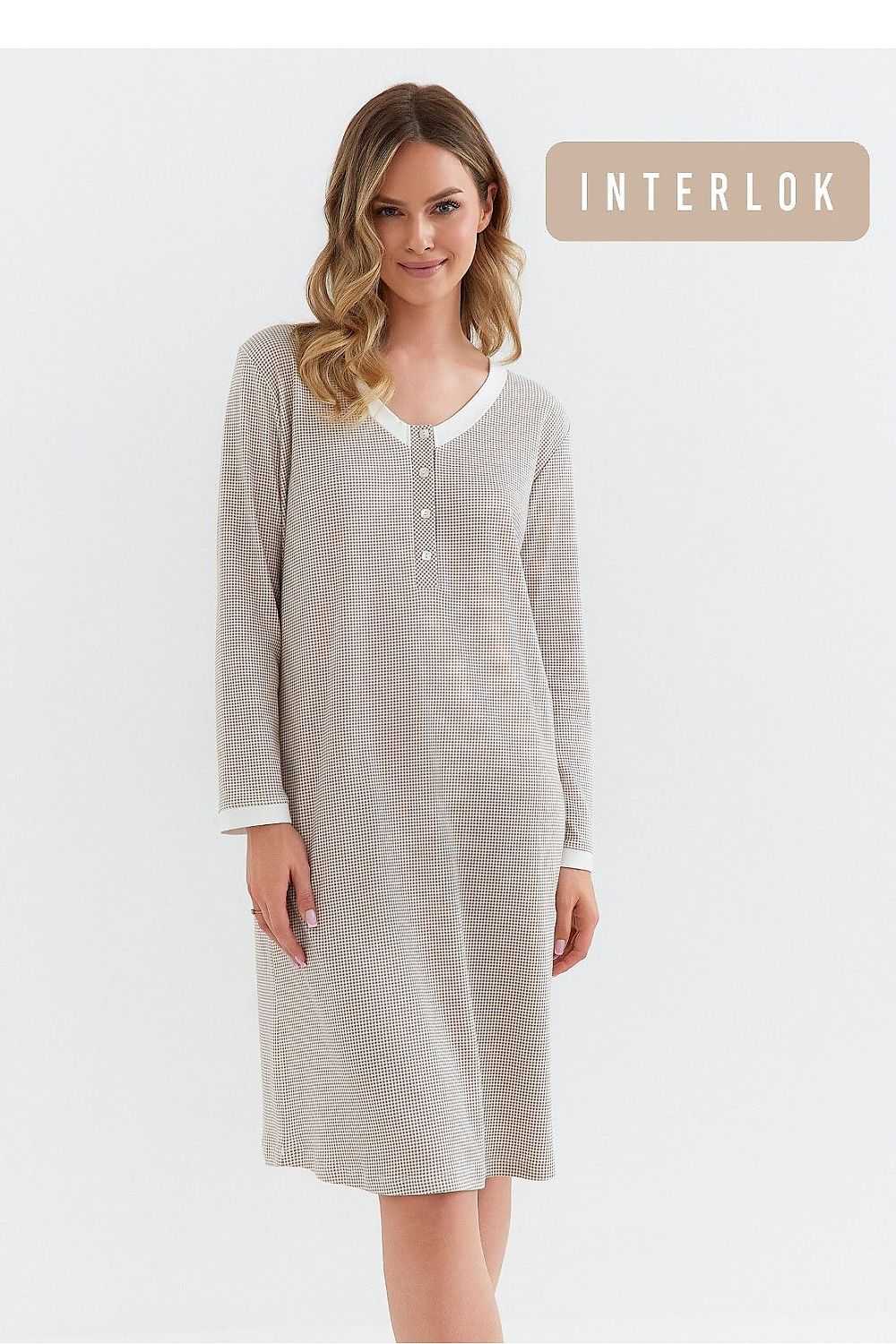 Women's nightshirt with long sleeves made of high-quality interlock cotton is the perfect choice for cooler nights. The soft, pleasant to the touch material with a delicate print provides comfort and warmth. The loose, relaxed fit guarantees comfort during sleep, and the button-down design makes it easy to put on, making this model perfect for breastfeeding mothers as well. The neckline finished with a trim adds aesthetic finishing touches. The nightshirt is knee-length and comes packed in a practical plastic bag, making it also a great gift.