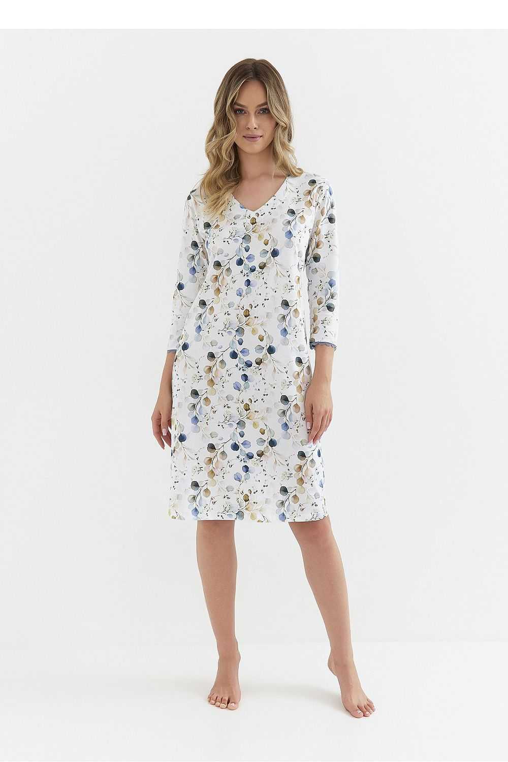 Women's shirt is an elegant and comfortable option for everyday wear. Made of soft and breathable fabric with a print, it provides comfort and freshness throughout the day. The V-neck subtly accentuates the silhouette, and the 3/4 sleeves finished with delicate lace add a feminine charm to the whole. The knee-length gives the shirt a lightness, making it perfect for warmer days.