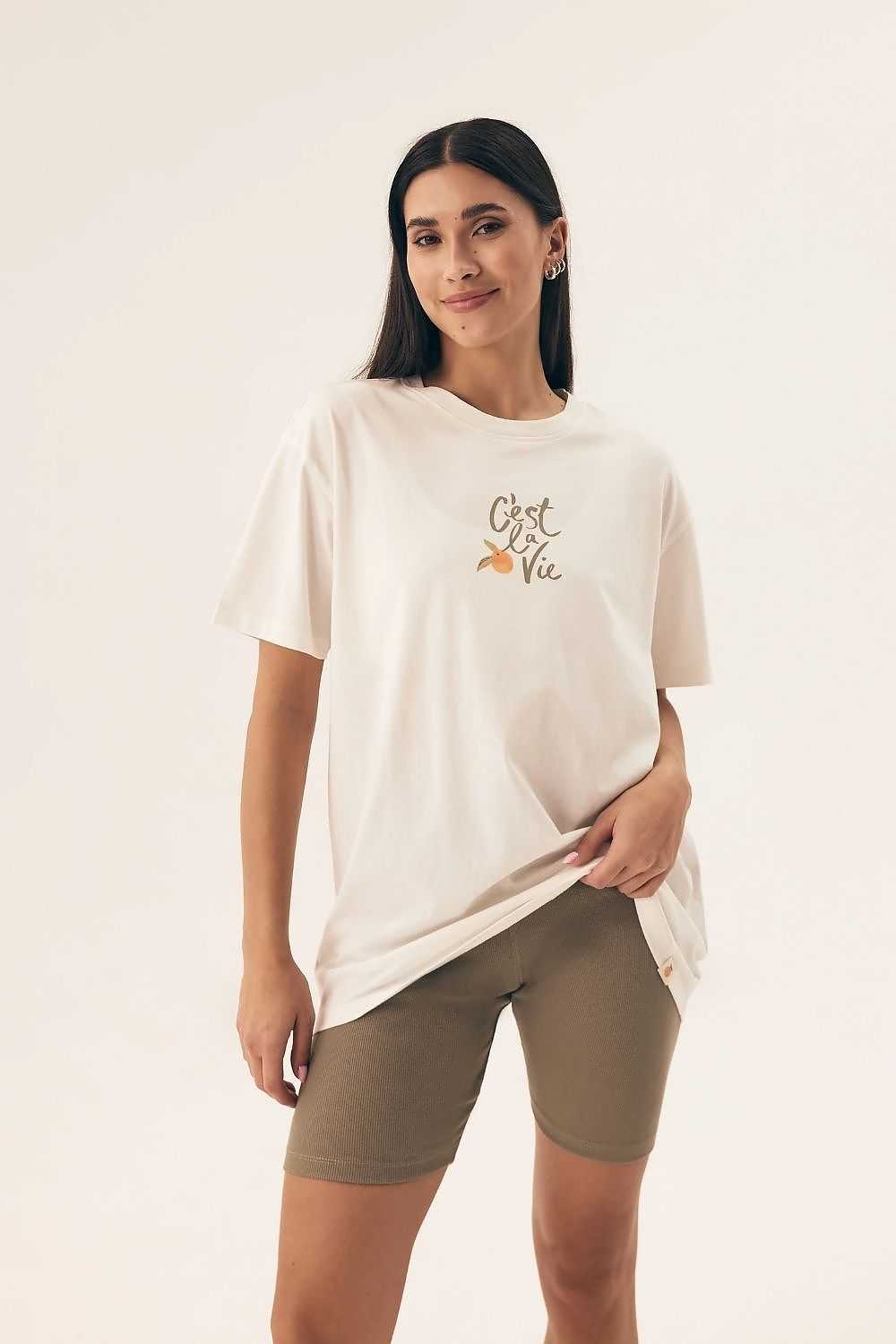 This women's pajama is a perfect combination of comfort and style, ideal for both sleep and as comfortable homewear. The short-sleeved blouse has a loose fit, round neckline, and a decorative inscription that adds a fashionable character to it. Made of soft and breathable fabric, it ensures exceptional wearing comfort. The fitted leggings-style shorts fit nicely on the silhouette, and the elastic waistband guarantees a perfect fit and comfort. The pajama is packed in a practical bag, making it also a great gift idea. It is the perfect choice for women who appreciate comfort and modern design!