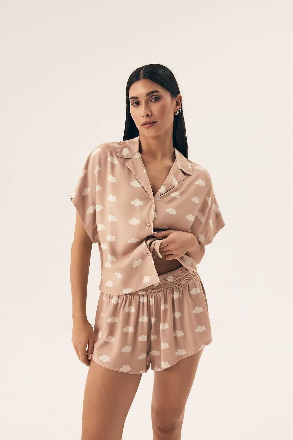 This ladies' pajama is a combination of elegance and comfort, perfect for warm nights. The short shirt with short sleeves, buttoned up, is finished with a delicate collar, giving it a subtle, classic look. The material with a print is soft, airy, and made of delicate viscose, ensuring comfort and allowing the skin to breathe. Shorts without pockets, equipped with a wide elastic waistband, perfectly fit the silhouette, guaranteeing comfort throughout the night. The pajamas are packed in a practical pouch, making it also a great gift idea. An ideal choice for women who appreciate a combination of style, comfort, and functionality in their nightwear!