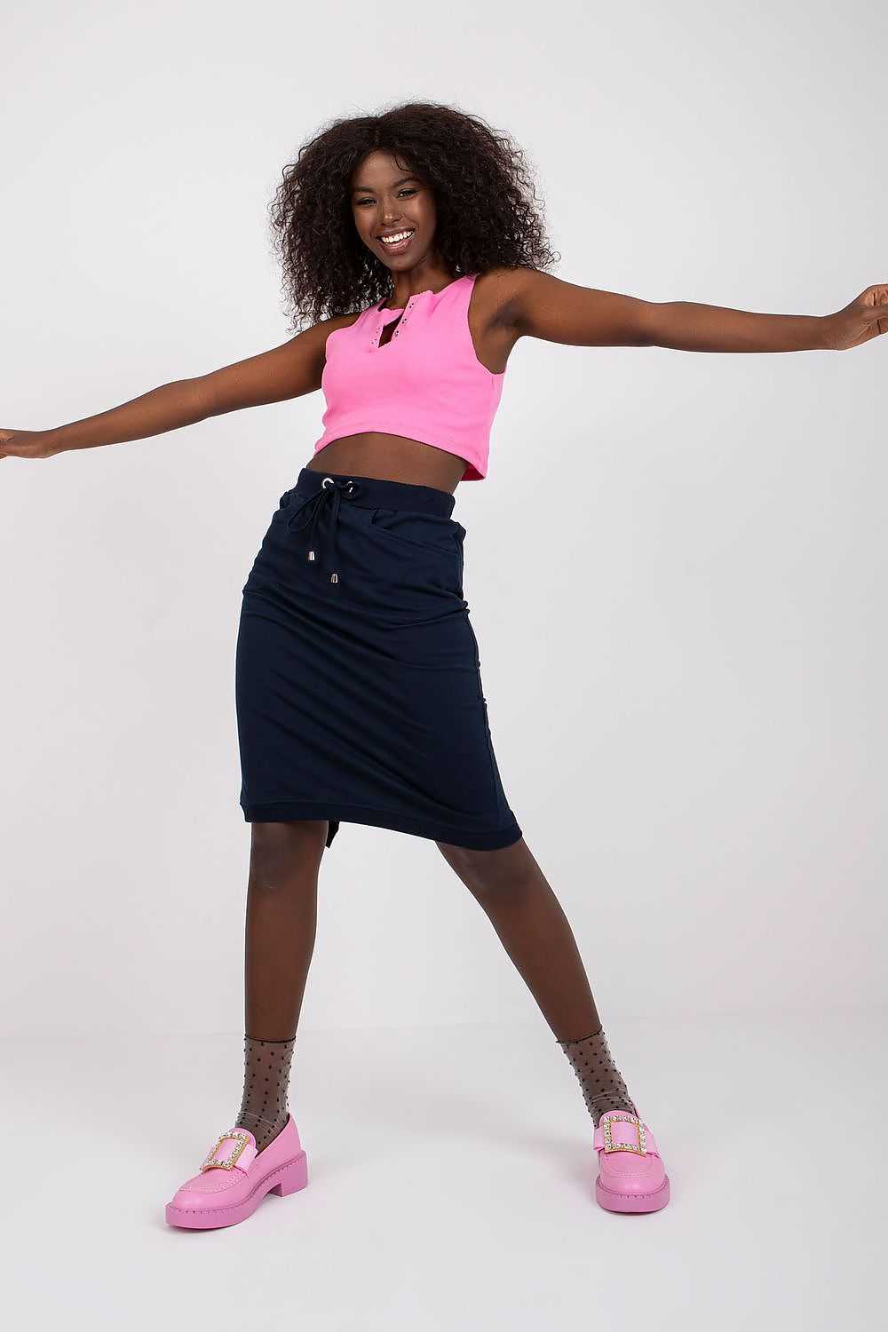 Sweatshirt skirt with elastic waistband and ties. The skirt has slip pockets.