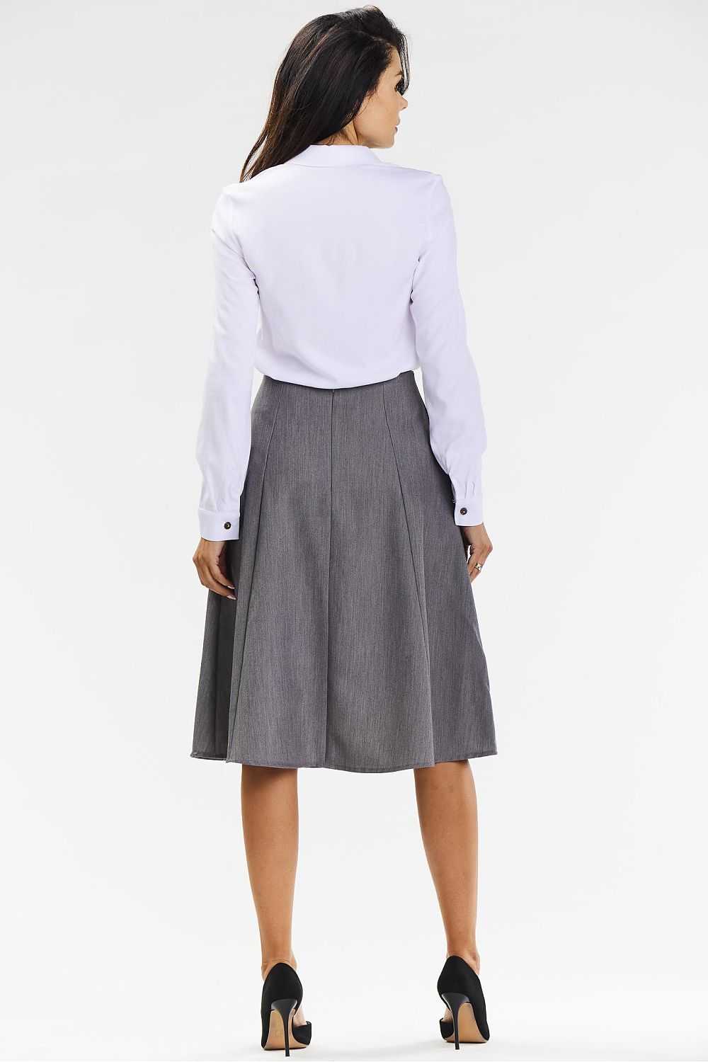 Elegant, flared midi skirt with wedges. Add elegance to your closet with our gray wedge midi skirt. The flared cut beautifully accentuates the waist while allowing freedom of movement. The covered zipper at the back guarantees a perfect fit, and its elegant style makes it perfect for formal and business occasions. The skirt was sewn in Poland from high-quality materials, which ensures durability and wearing comfort. Precise workmanship guarantees an aesthetically pleasing appearance and long-lasting use. It goes well with a shirt and stilettos for formal occasions and with a turtleneck and boots for cooler days. Ideal for business meetings, work and formal occasions. Product made in Poland.