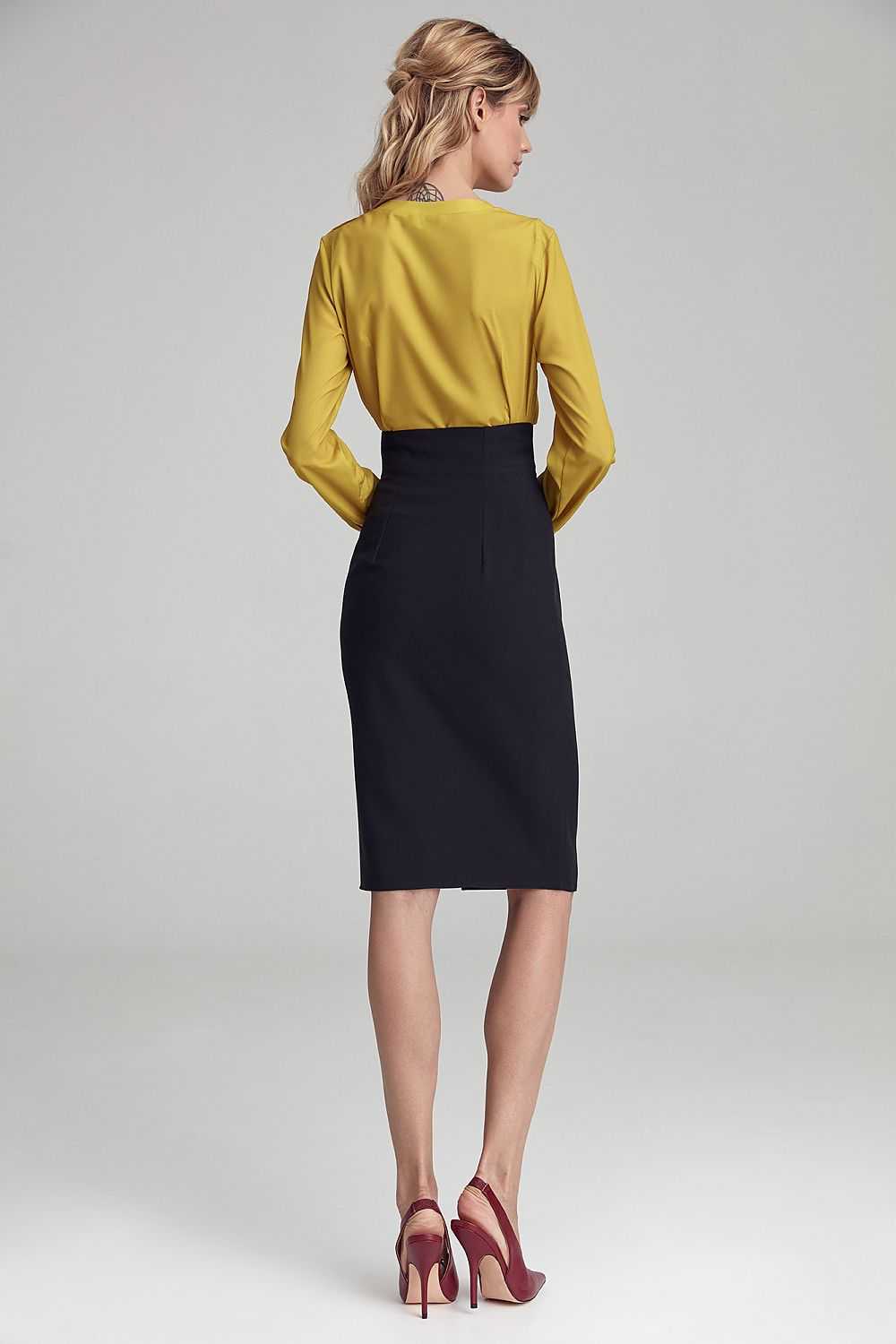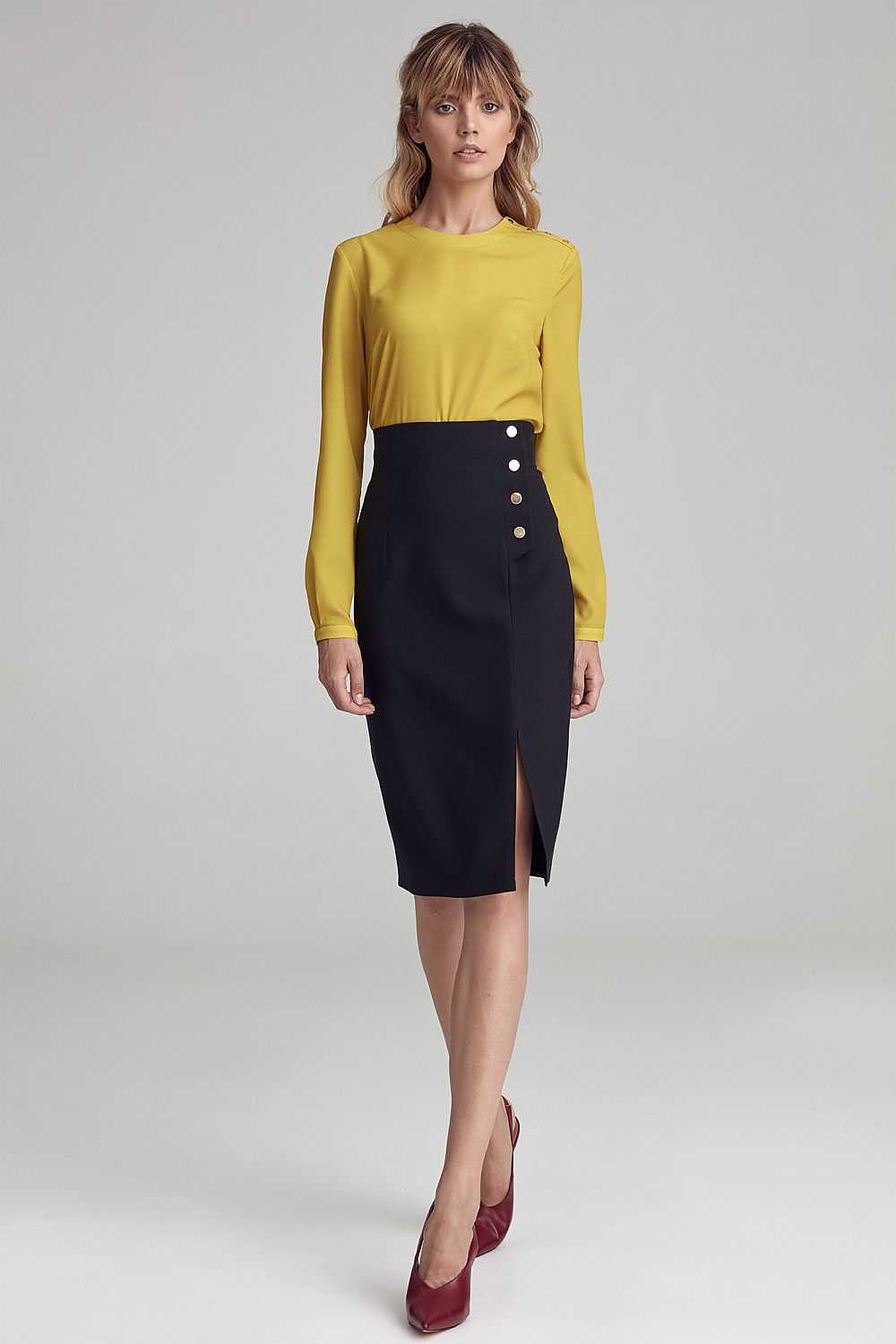 A simple pencil knee-length skirt is a perfect element of soft office styling. Paired with a white shirt and a jacket, it creates a classic office look, while paired with a patterned blouse, it breaks the norm. The pleasant to the touch material with a touch of viscose ensures high wearing comfort, and the golden snaps perfectly suggest what accessories go well with this skirt.