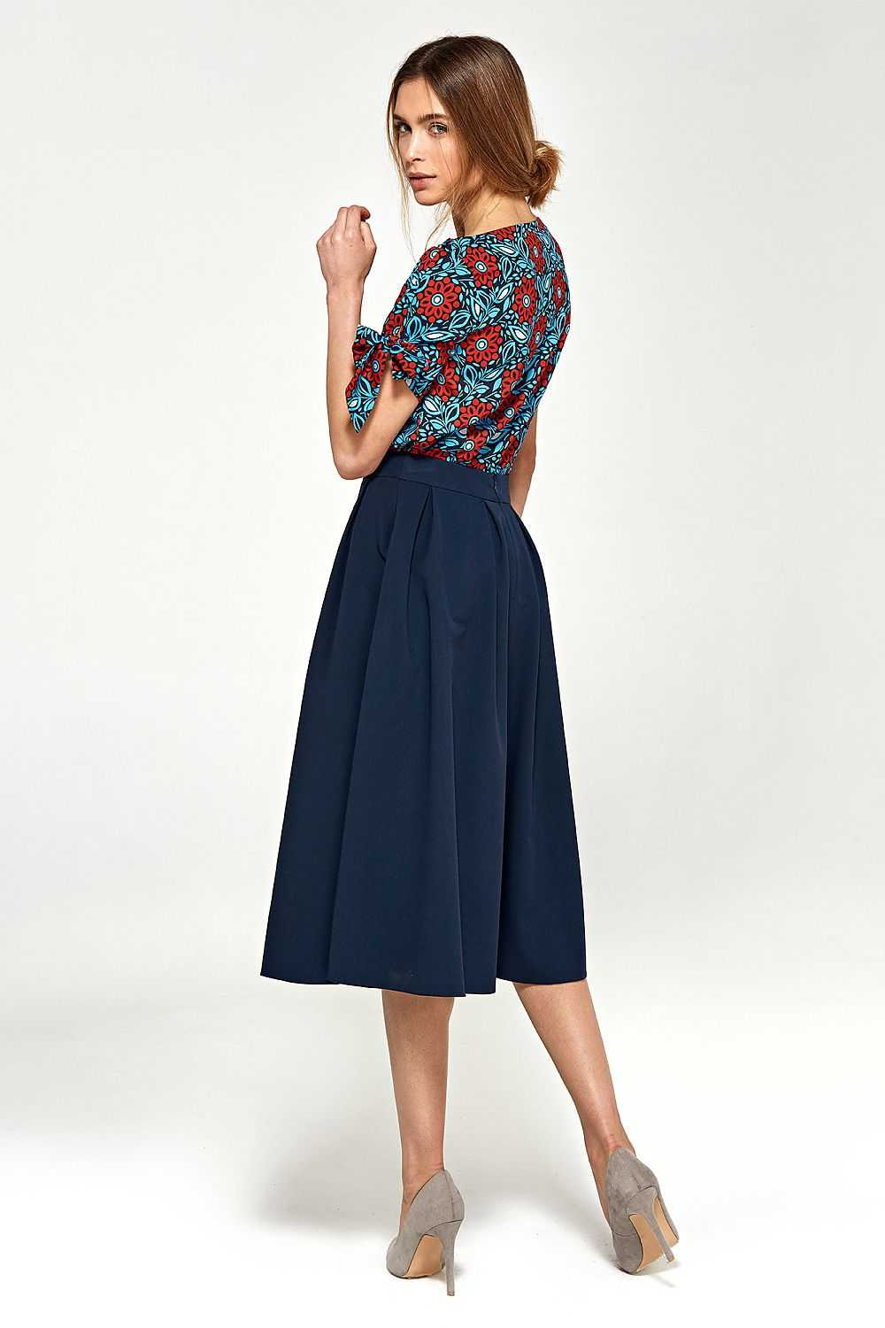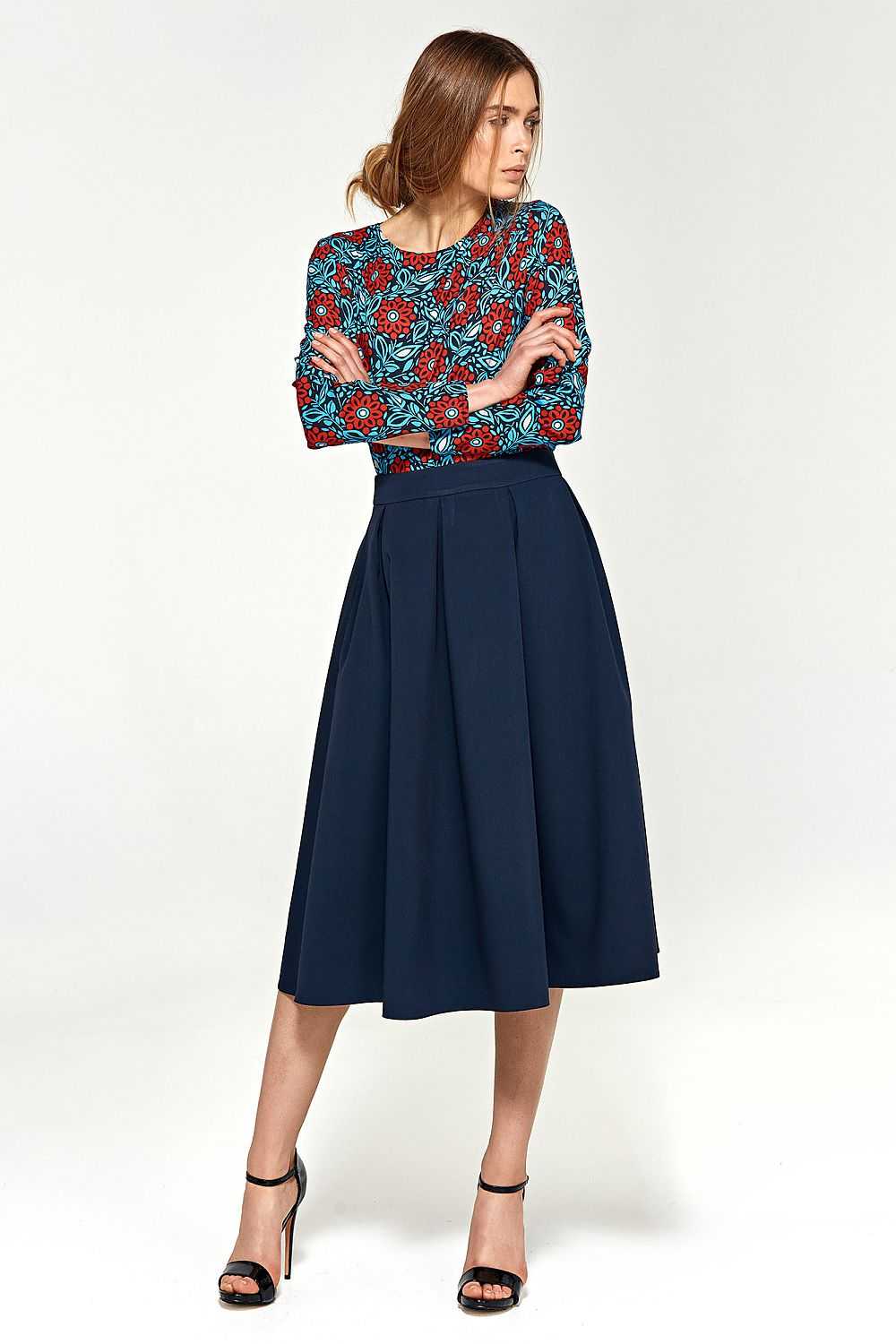 A flared midi skirt with pleats is a great choice for any occasion! The model has pockets hidden in the side seams. The skirt has a clearly defined waistline.