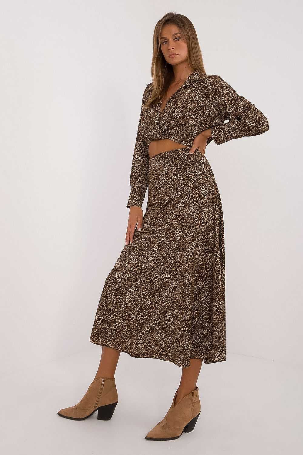 Stylish women's set with an animal motif, perfect for everyday occasions. The set consists of a blouse and a skirt made of a soft blend of polyester and elastane, which ensures comfort when wearing. The long-sleeved blouse has a wrap neckline with a collar, which gives it an elegant and casual character. The skirt pairs well with the blouse, creating a cohesive whole. This set is a perfect choice for everyday wear when you want to look fashionable and feel comfortable.