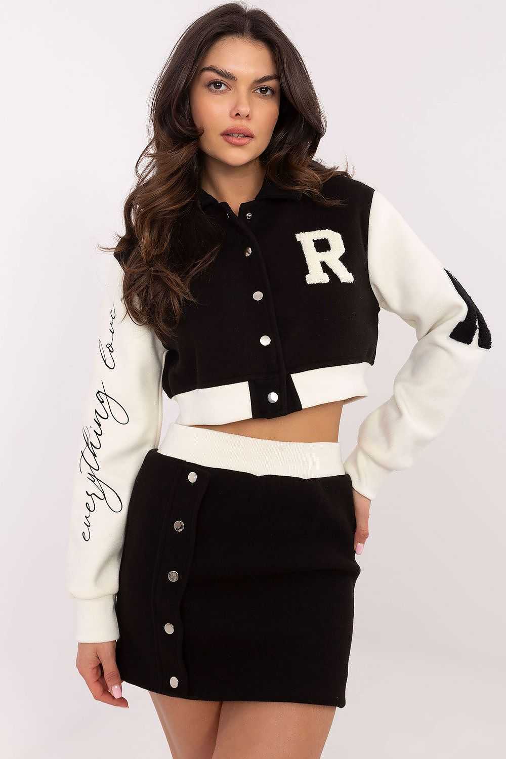 Elegant and comfortable women's casual style set, perfect for everyday occasions. Made of durable polyester with a lining, it provides comfortable wear and a modern look. The short-length blouse features long sleeves, a stand-up collar and a practical press-stud closure, which emphasizes its sporty character. Decorative patches on the sleeve and front, as well as embroidery on the other sleeve, add to its originality. The short length skirt is equipped with a wide elastic waistband, which guarantees a comfortable fit and emphasizes the waist. The smooth pattern of the set gives it versatility, perfectly matching both minimalist and more distinctive styling. This is a practical and fashionable set for women who want to combine comfort with distinctive design.