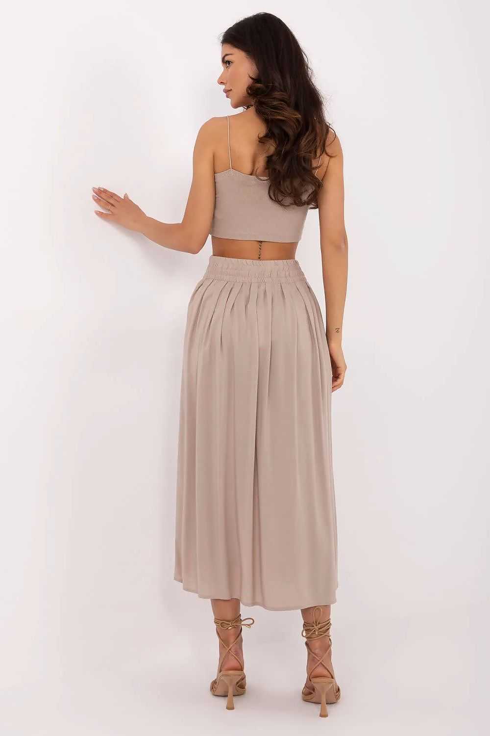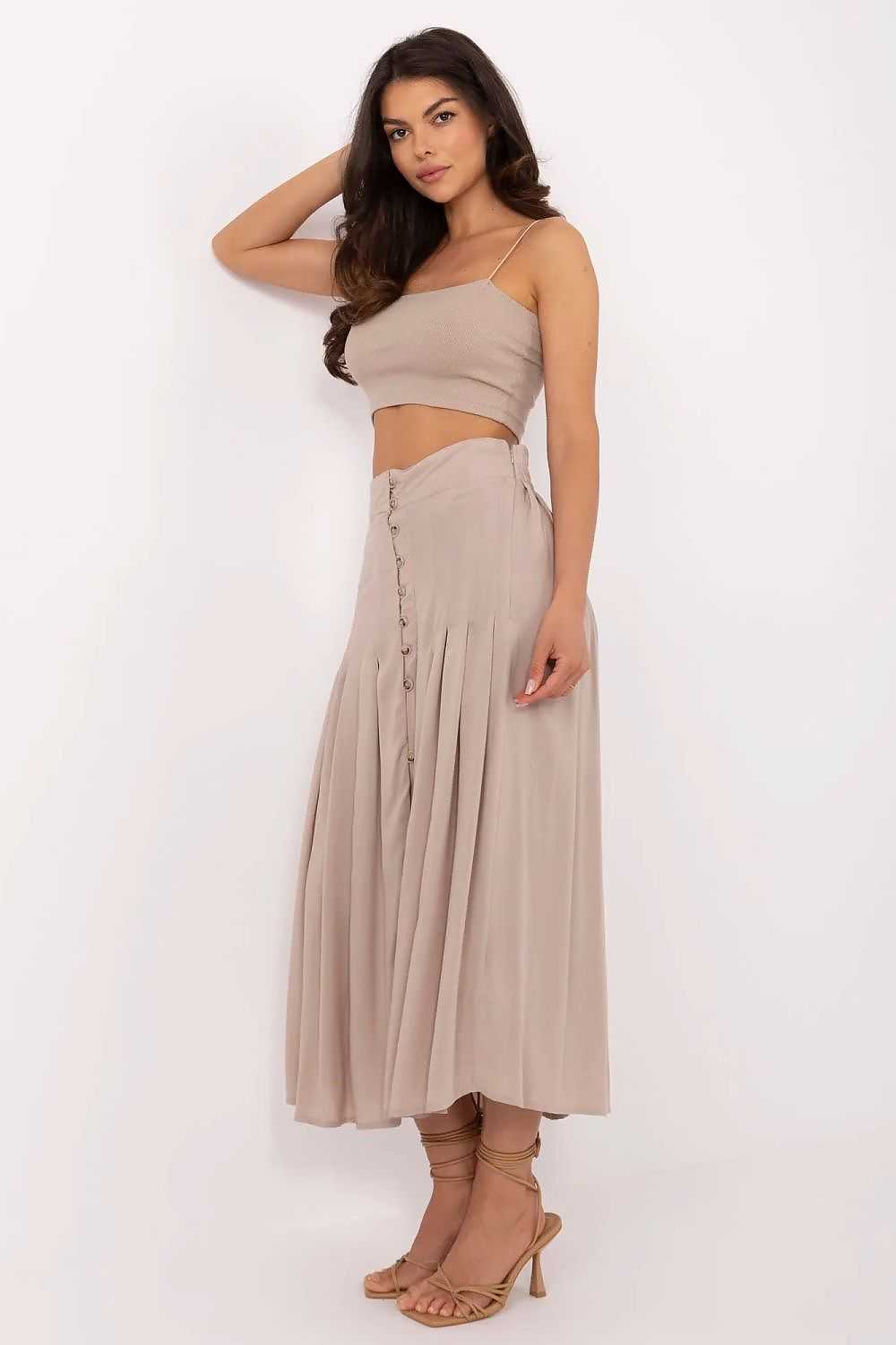 Stylish, pleated midi skirt is a perfect choice for everyday wear and work. Made of ecological viscose, it combines a fashionable look with comfort and environmental care. The model with a smooth finish, with decorative buttons at the front, looks elegant and modern. The pleating adds lightness, and the elastic band sewn at the back in the waist ensures a comfortable fit to the silhouette. The concealed zipper on the side makes it easy to put on and does not disrupt the line of the cut. This is a versatile and feminine skirt that will work great in casual and office stylizations.