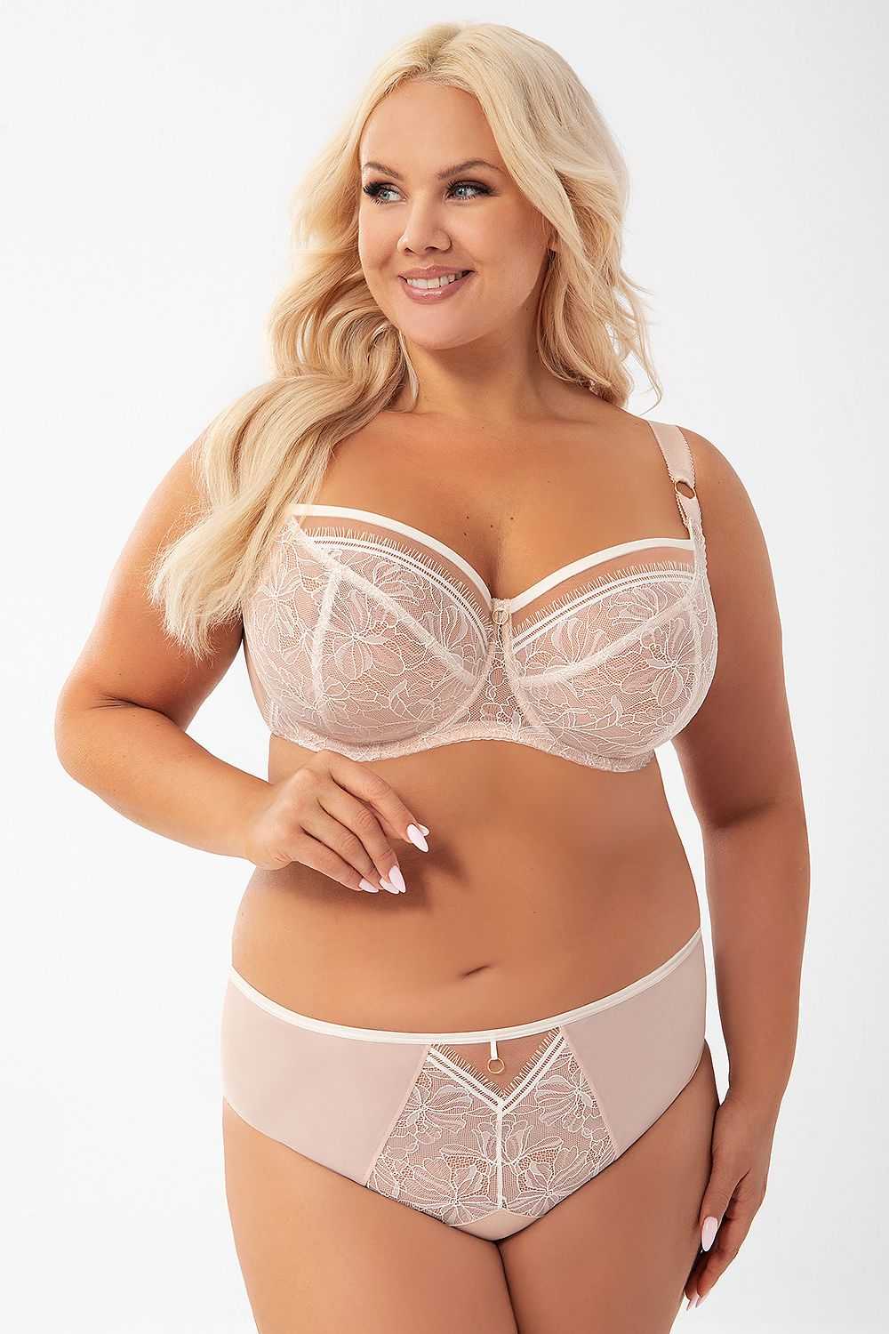 Elegant soft bra designed for larger busts, combining comfort, functionality, and style. Made of high-quality, breathable fabric and lining that ensures comfortable wear throughout the day. Cups trimmed with satin tape, using flat seam technology, guarantee a subtle finish and no skin irritation. The model is equipped with lower and side boning, providing excellent support for the bust, while gathering the breasts from the sides to the center of the neckline, beautifully shaping the silhouette. Decorative stitching and elegant lace give the bra a feminine, timeless character. The straps are non-detachable, adjustable, soft, and comfortable. The band can also be adjusted to fit the silhouette. Breathable, quick-drying material and nickel-free accessories make this model perfect for everyday wear and special occasions. Fastened at the back, packed in an aesthetic box, a perfect choice for women who value quality and comfort.